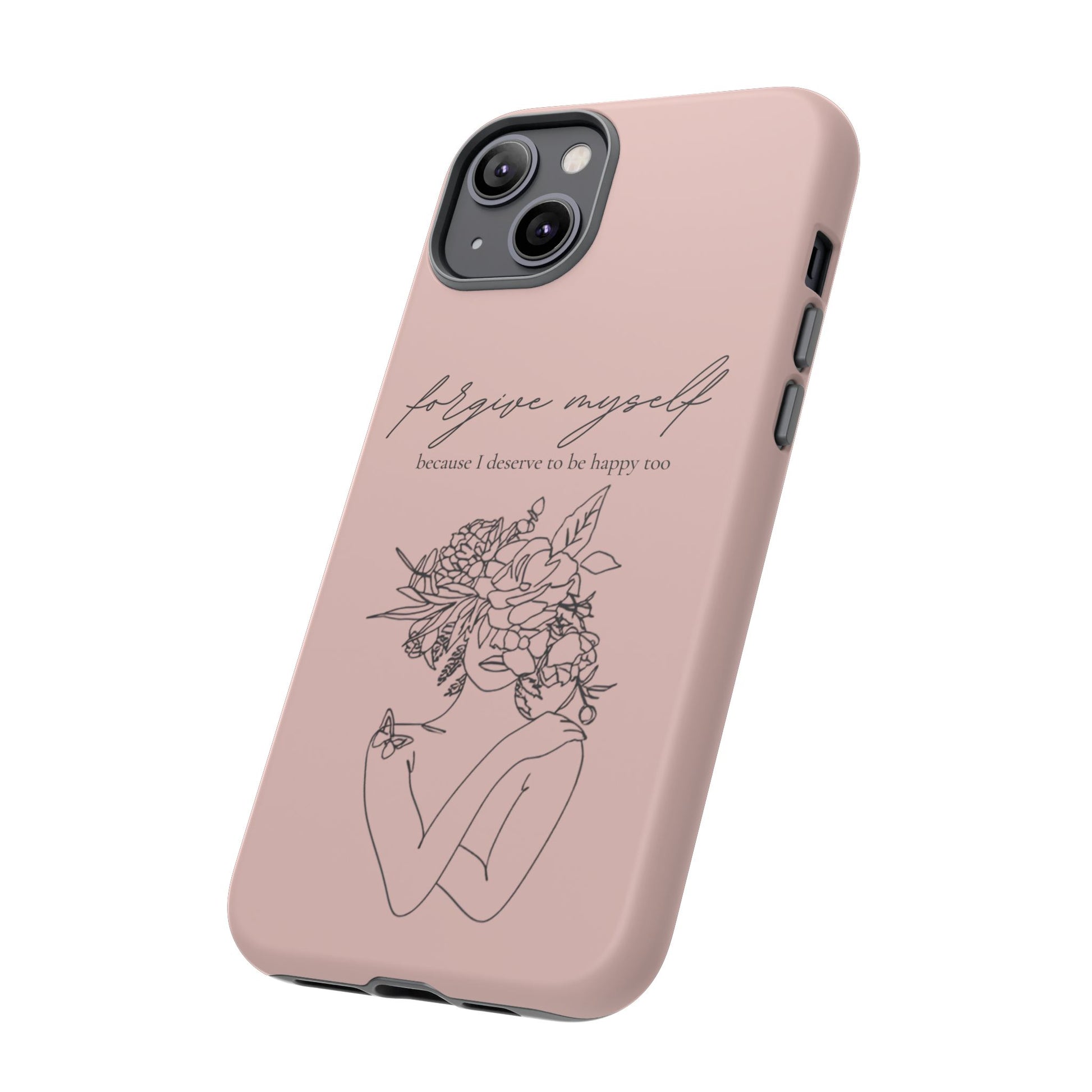 This slim, dual-layer phone case blends quiet elegance with dependable protection. A soft blush backdrop frames a delicate line illustration of a woman crowned in blooms, paired with the gentle reminder “forgive myself — because I deserve to be happy too.” It feels like a small, daily moment of self-compassion you can carry everywhere. The glossy or matte finish keeps the art crisp; a snug TPU silicone liner soaks up shocks while a rigid polycarbonate shell resists impacts. Precise cutouts preserve easy access to ports and wireless charging, while UV-resistant printing keeps the colors true through everyday wear. Light, feminine, and thoughtfully built — made with compliant materials and crafted for long-term use.